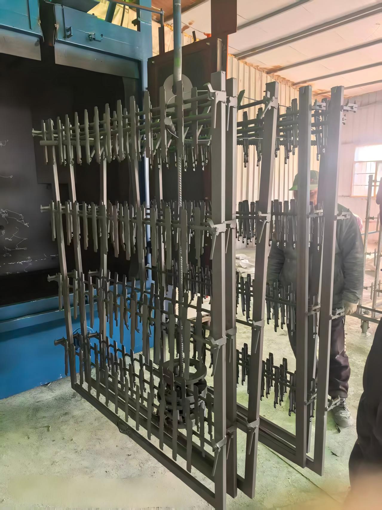 喷塑挂具表面塑粉经热洁炉高温处理,然后经过3710单吊钩抛丸机拋丸,使挂具表面更清洁,不会因为挂具表面有灰尘落到产品上面。