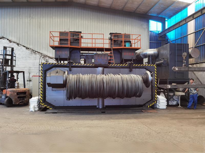 线材抛丸机集无酸洗、环保、节能、高效、使用便捷等优点于一身,其主要功能是非酸洗清除线材表面的氧化皮、油垢及锈垢,使线材表面获得均匀一致的金属光泽以提高后期涂饰质量及防腐效果。同时还具有消除线材内应力,提高线材表面抗疲劳强度,延长使用寿命等特点,消除了线材酸洗除锈对环境造成的污染及对人身体造成的伤害。